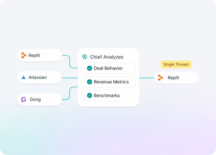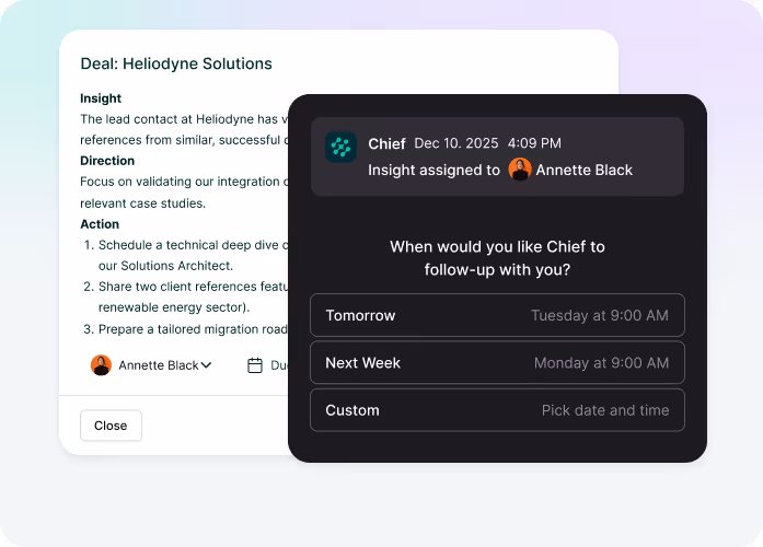Chief runs quietly in the background, analyzing deal behavior and surfacing risks. You get clear, explainable alerts and daily summaries where you already work (Slack, email, etc).